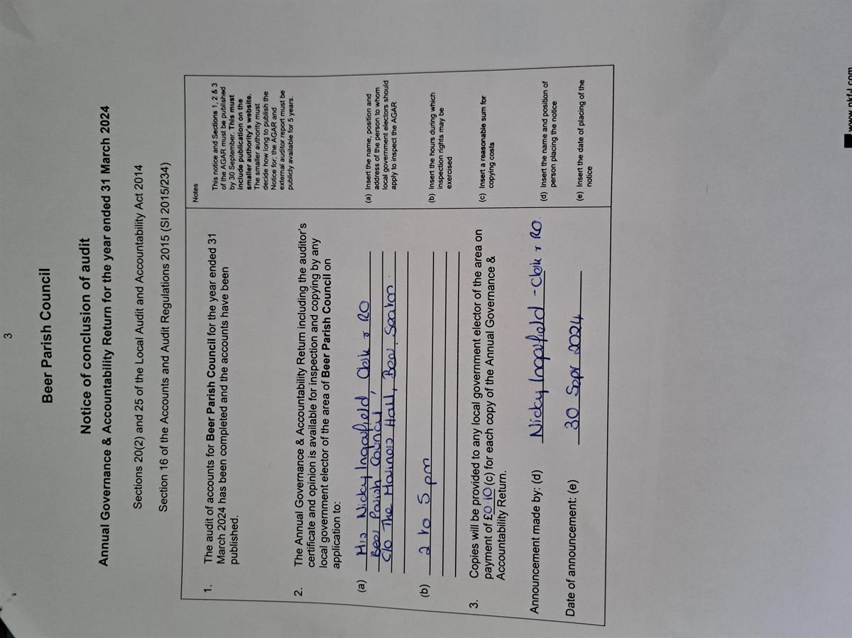 Beer Parish Council Annual Return 2020/21Period for the exercise of public rights 2020/21External Auditor Report 2020/21Notice of Conclusion of Audit 2020/21
